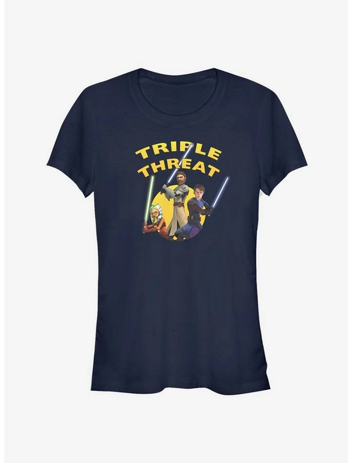 Best of three! This fitted navy blue tee — inspired by Star Wars: The Clone Wars — features a triple threat to the Dark Side: Obi-Wan Kenobi, Anakin Skywalker and Ahsoka Tano.