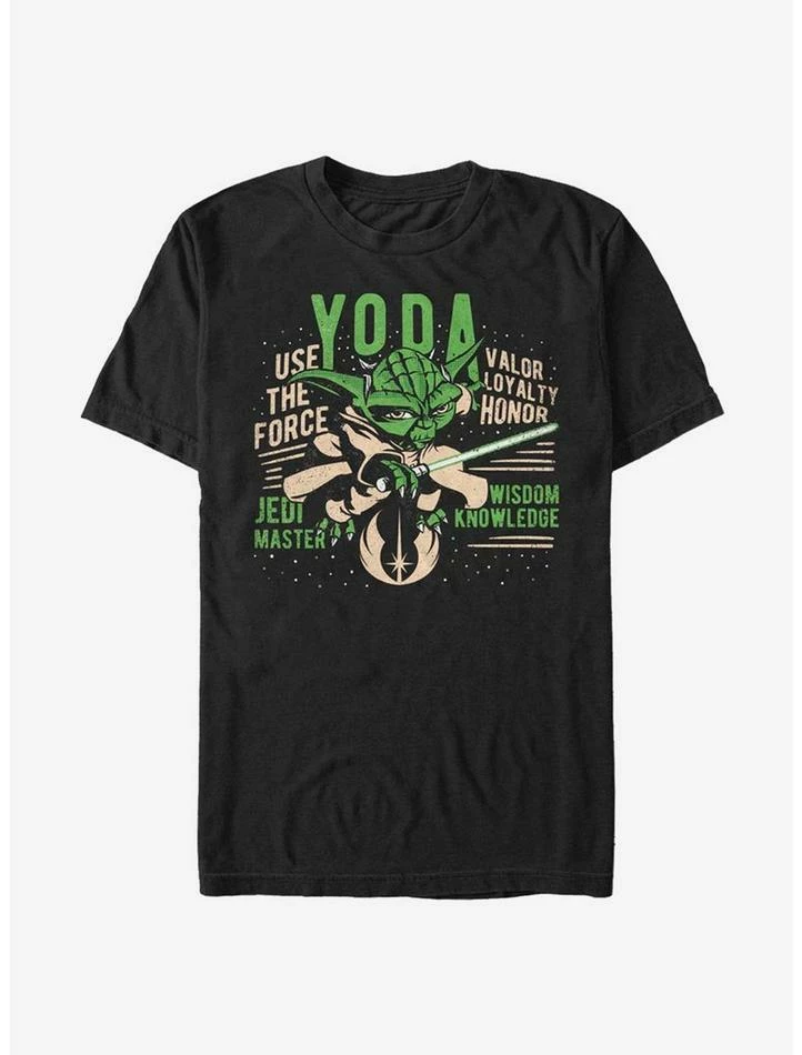 Valor. Loyalty. Honor. Wisdom. Knowledge. Jedi Master Yoda possesses all of these attributes. Use the Force and grab this black tee inspired by Star Wars: The Clone Wars.