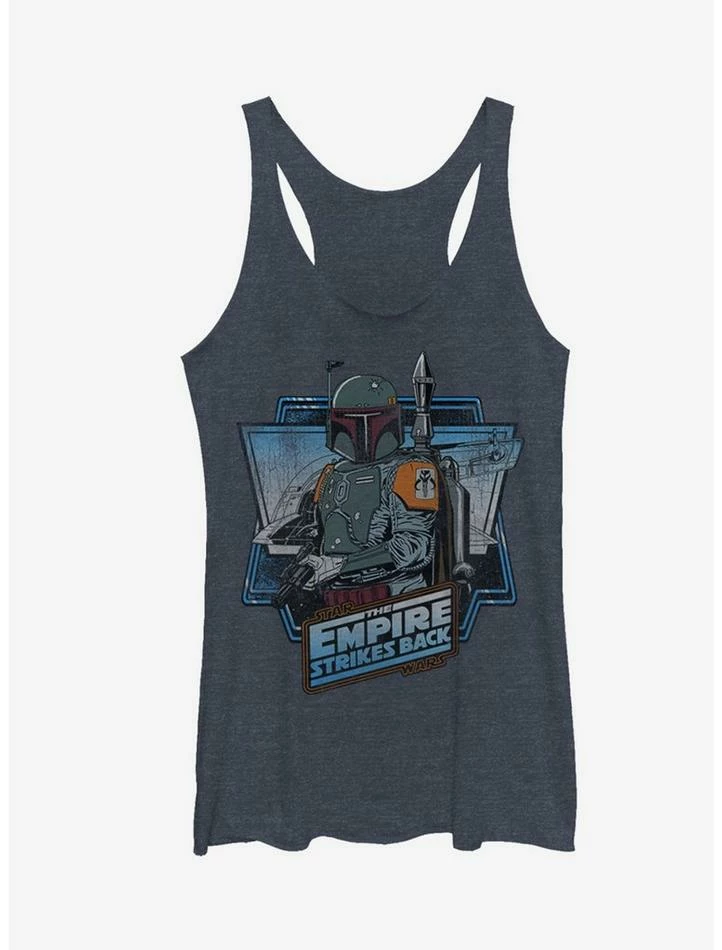 Boba Fett fans will not be able to resist this heathered navy blue racerback tank top. Boba Fett, the greatest bounty hunter in the galaxy, is printed on the front of this awesome Star Wars top with The Empire Strikes Back logo printed below.ย