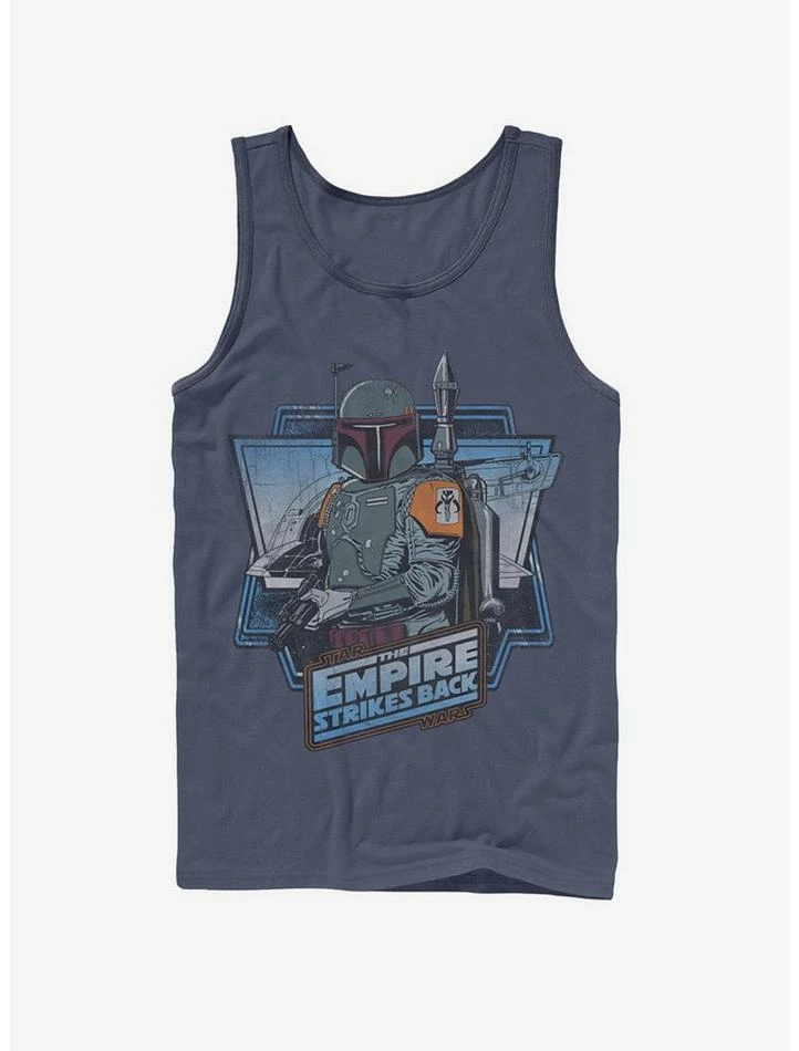 Boba Fett fans will not be able to resist this navy blue tank top. Boba Fett, the greatest bounty hunter in the galaxy, is printed on the front of this awesome Star Wars tank with The Empire Strikes Back logo printed below.