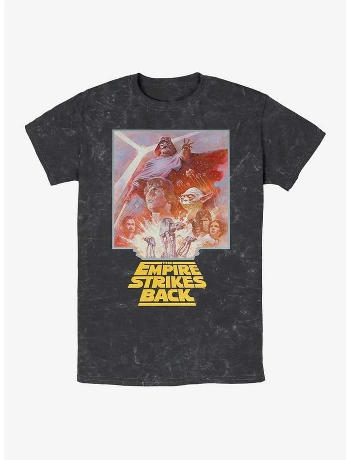 The Star Wars saga continues! This black mineral washed tee has poster art from Episode V – The Empire Strikes Back featuring Darth Vader, Luke Skywalker, Yoda, AT-AT walkers and more.