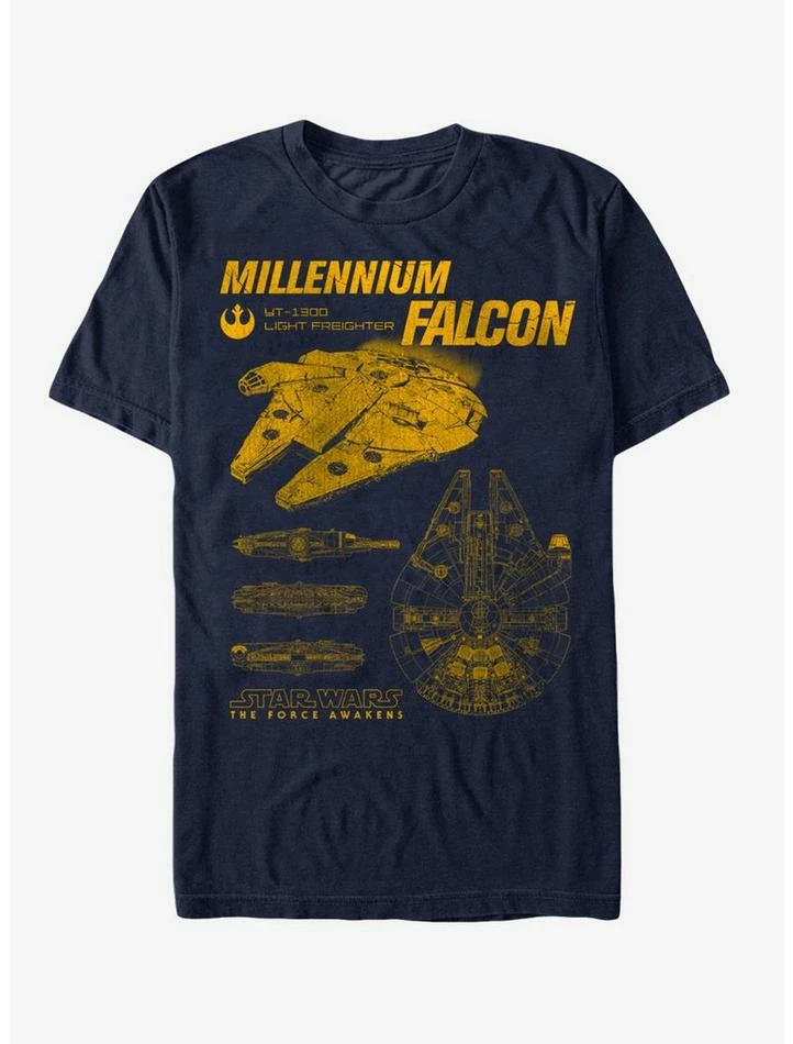 Prepare for hyperdrive; the Star Wars The Force Awakens Millennium Falcon Blueprints Navy Blue T-Shirt is here and ready to rock! The blueprints of the famous YT-1300 spaceship flown by Captain Han Solo and Co-Pilot Chewbacca are printed on the front of a durable navy Star Wars tee. 100% Cotton.