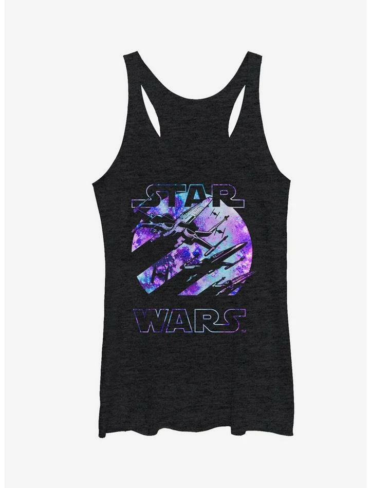 All the best X-Wing pilots are talking about the Star Wars The Force Awakens X-Wing Heather Black Racerback Tank Top. A vintage-style print on the front of this black Star Wars Episode 7 shirt features X-Wing fighters being tailed by TIE fighters next to the Star Wars Episode VII logo. 50% Polyester, 25% Cotton, 25% Rayon.