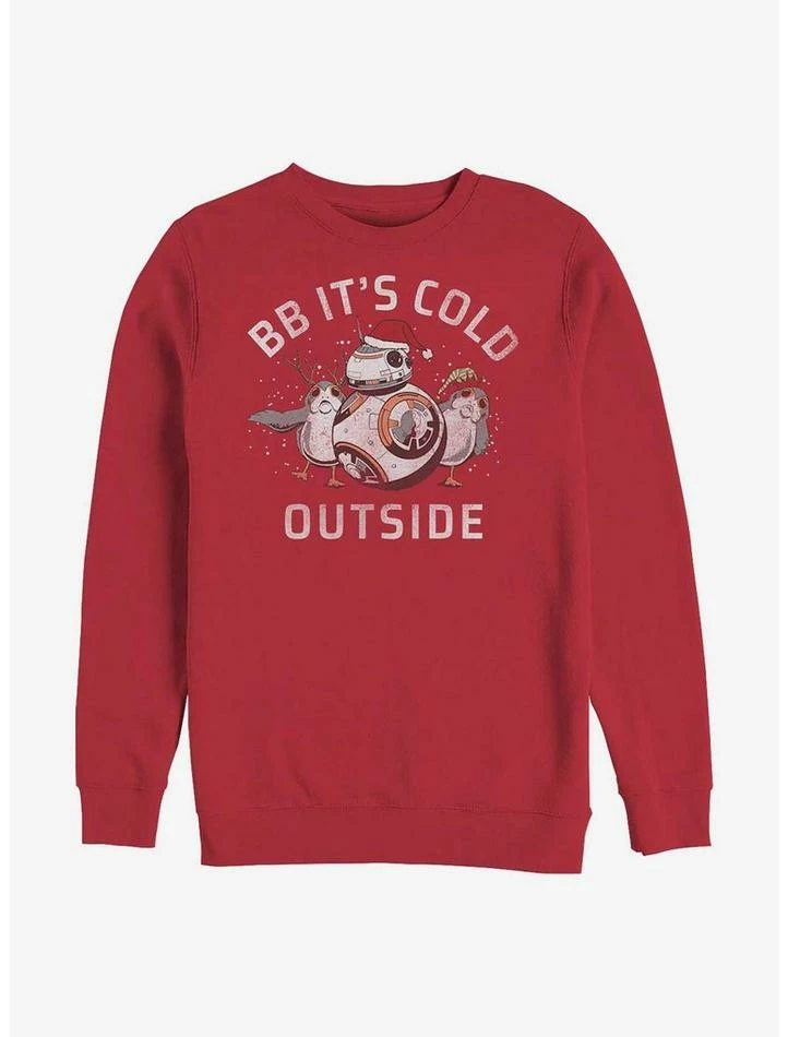 Brr! BB it’s cold outside! This cute ‘n’ clever red crewneck Star Wars sweatshirt features adorable droid BB-8 in a Santa Hat, flanked by a reindeer Porg and an elf Porg.
