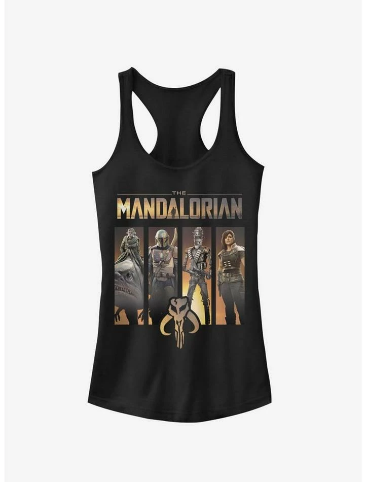 Special delivery from the outer reaches of the galaxy! This fitted black tank, from the Disney+ series The Mandalorian, displays the show’s logo above boxes featuring images of Kuiil, The Mandalorian, IG-11 and Cara Dune.