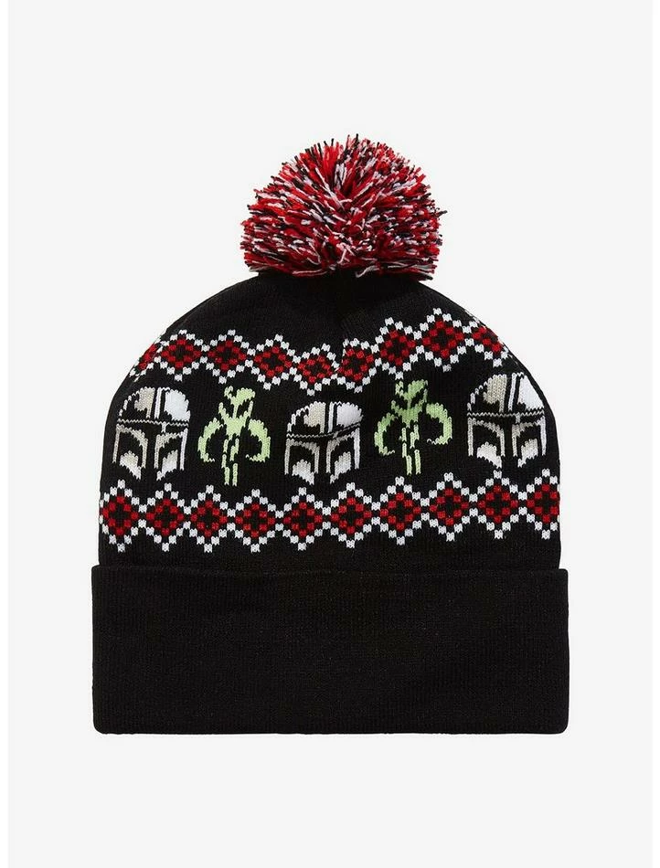 The force is strong with this beanie! From The Mandalorian, this beanie features a repeated pattern of Mando’s helmet and the Mythosaur skull, plus chibi Grogu embroidered on the cuff and pom detailing at the top.