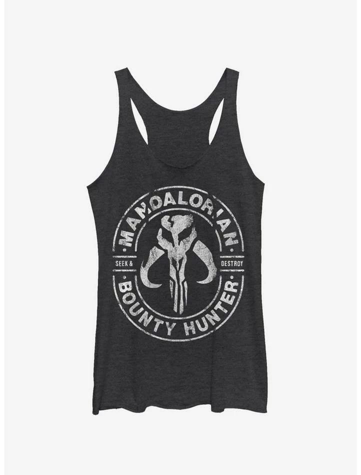 Don’t mess with Mandalorians. This heather black tank, inspired by the Disney+ series, features the warrior clan’s iconic symbol – a Mythosaur skull – and says “Seek & Destroy.”