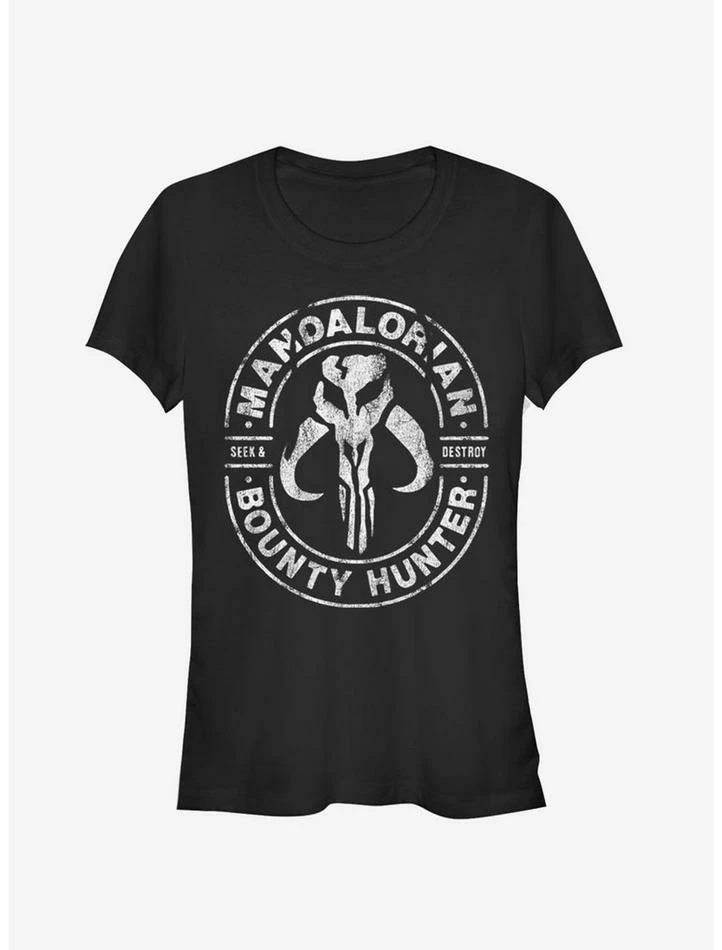 Don’t mess with Mandalorians. This fitted, lightweight black tee, inspired by the Disney+ series, features the warrior clan’s iconic symbol – a Mythosaur skull – and says “Seek & Destroy.”