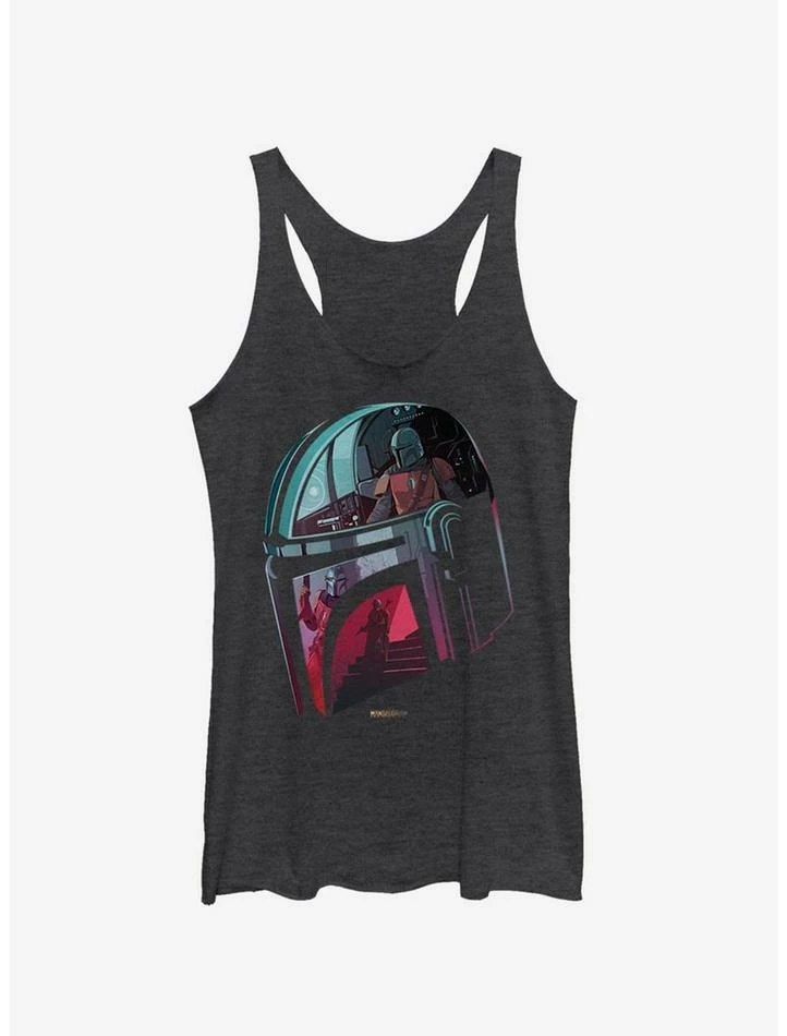 Mando’s helmet reveals all. This heather black Star Wars tank, inspired by the Disney+ series The Mandalorian, features images of your new favorite bounty hunter in action, reflected on the surface of his helmet.