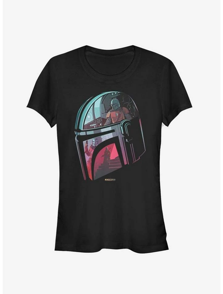 Mando’s helmet reveals all. This fitted, lightweight black Star Wars tee, inspired by the Disney+ series The Mandalorian, features images of your new favorite bounty hunter in action, reflected on the surface of his helmet.