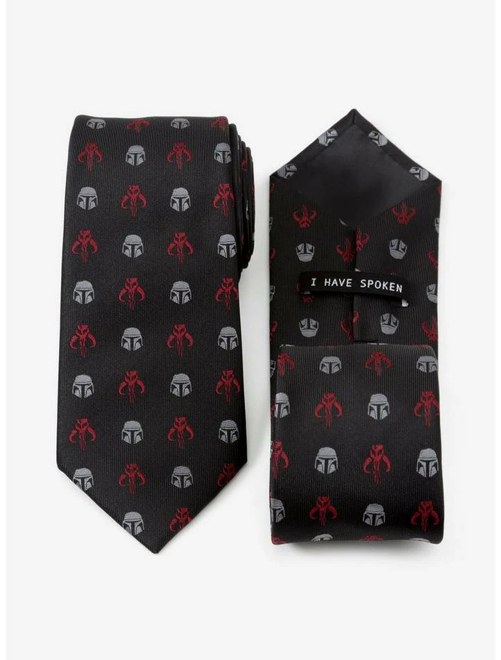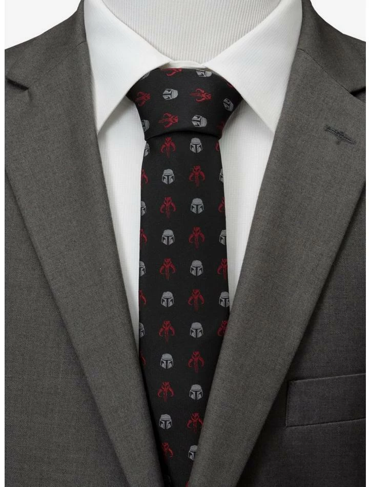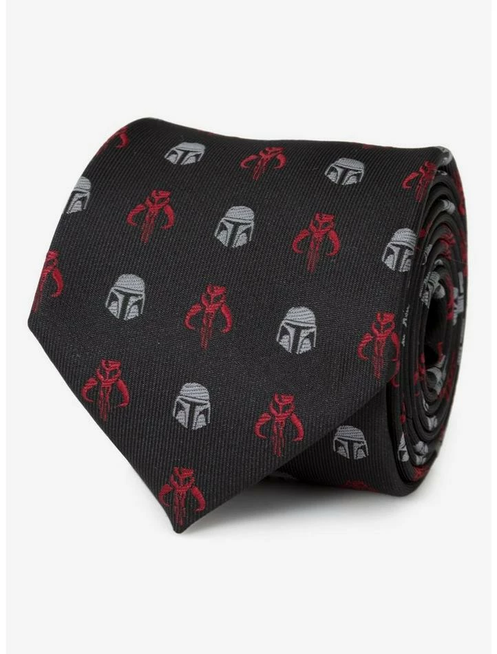 A man of your skill should make short work of wearing this tie. Featuring alternating rows of crimson Mythosaur skulls and silver Mando helmets, this black neck tie from The Mandalorian is a new way to showcase your fandom. Wear alone or pair with any of our matching Mandalorian accessories for a complete formal look. Officially licensed by Lucasfilm LTD.