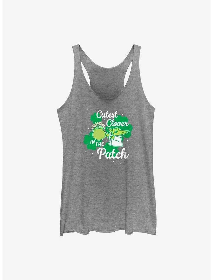 Pot o’ gold… or bag o’ snacks? This heather grey Star Wars tank features the cutest clover in the patch — Grogu — gettin’ lucky.