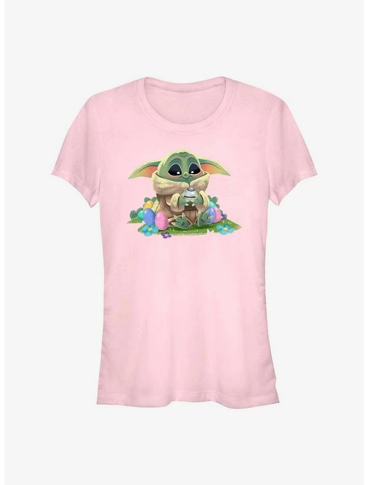 This shirt is to dye for! Grogu — AKA The Child — holds his silver ball and sits amongst colorful Easter eggs on a fitted light pink Star Wars tee.