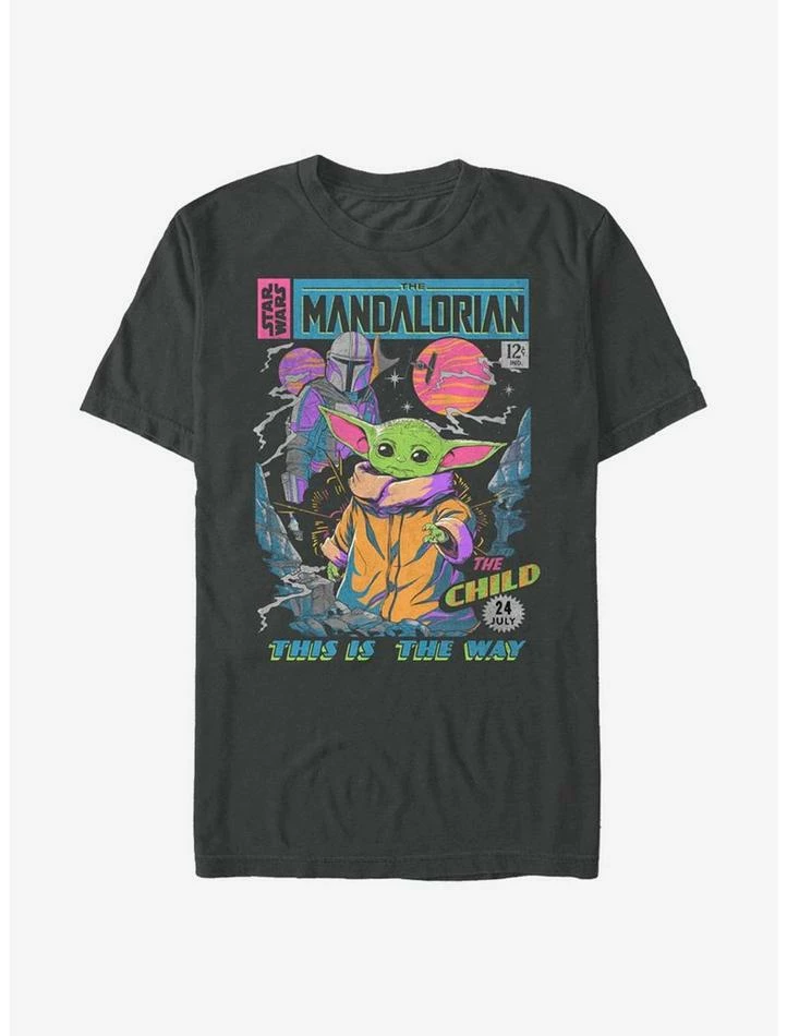 This is the way… to your new favorite Star Wars shirt! The Child — AKA Grogu — appears with The Mandalorian in a neon, comic book-inspired front screen on the front of a lightweight, charcoal grey tee.
