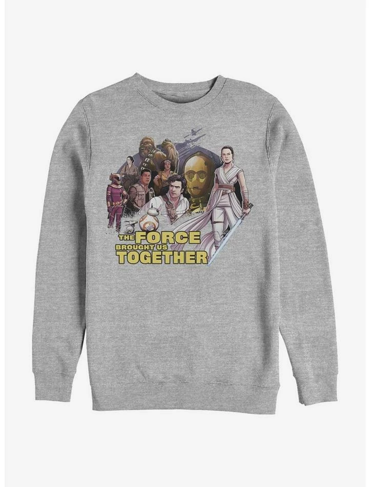 The Force brought them together. This heather grey crewneck sweatshirt — inspired by Star Wars: Episode IX – The Rise of Skywalker — features Rey, Poe, Finn, C-3PO, Chewbacca and more.