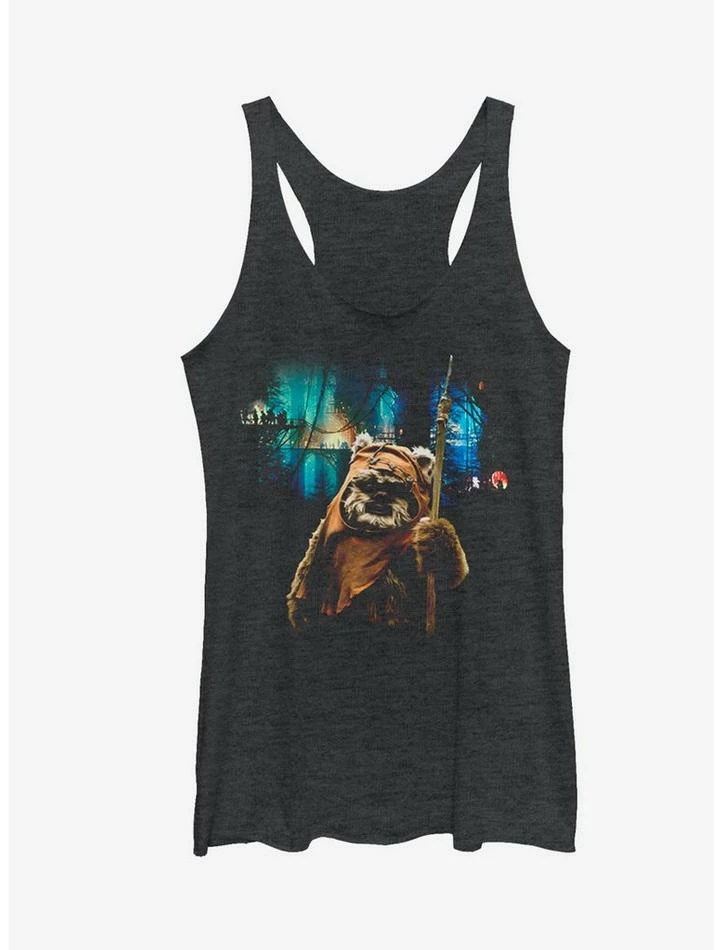 Defeat the Empire and bring the Battle of Endor to a close with the Star Wars Tree Village Wicket Ewok Heather Black Racerback Tank Top! Wicket stands holding his spear with his tree village behind him printed on the front of this cool black Ewok shirt. 50% Polyester, 25% Cotton, 25% Rayon.