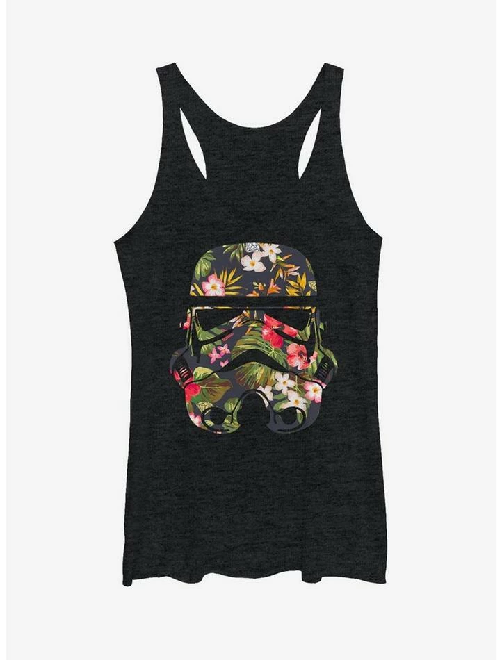 Even those on the Dark Side can stop and smell the hibiscus with this black Star Wars tank. This unique Star Wars top features a Stormtrooper helmet in a colorful tropical floral print — so fans can celebrate the sunny side of the soldiers of the Galactic Empire.ย
