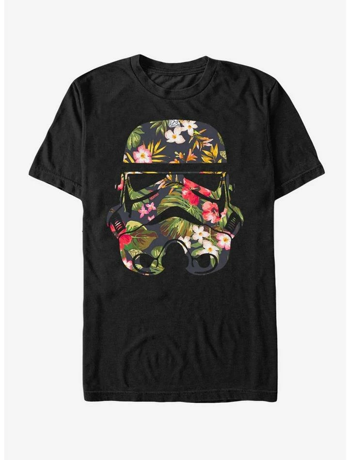 Even those on the Dark Side can stop and smell the hibiscus with this black Star Wars tee. This unique Star Wars shirt features a Stormtrooper helmet in a colorful tropical floral print — so fans can celebrate the sunny side of the soldiers of the Galactic Empire.ย