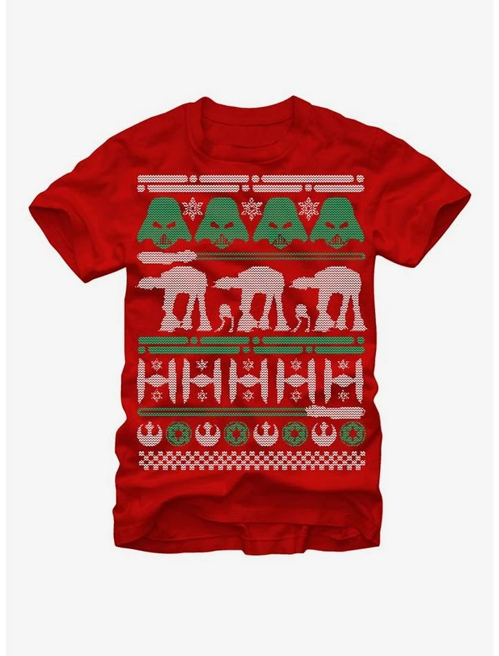 The traditional ugly Christmas sweater just got a galactic makeover to bring you the Star Wars Christmas Sweater Red T-Shirt. Darth Vader, TIE fighters, AT-AT walkers, and more come together to create a holiday pattern on this durable graphic tee. 100% Cotton.