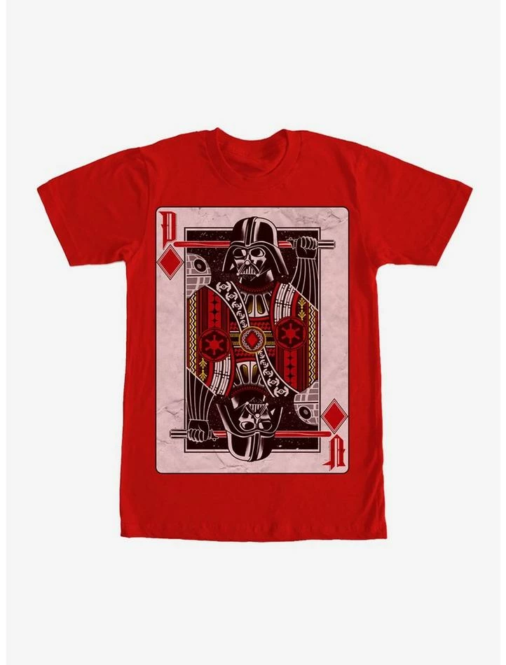 The classic playing card gets an Empire-themed makeover to bring you the Star Wars Vader in the Cards Red T-Shirt. Darth Vader takes the role of king on this unique Star Wars t-shirt, with his famous red lightsaber in hand. 100% Cotton.