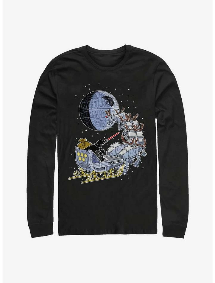 Bring those gifts to all the good girls and droids! This black long-sleeved Star Wars tee features a team of AT-AT walkers guiding Santa… ahem… Vader as he brings the Dark Side of the holidays to the Death Star.