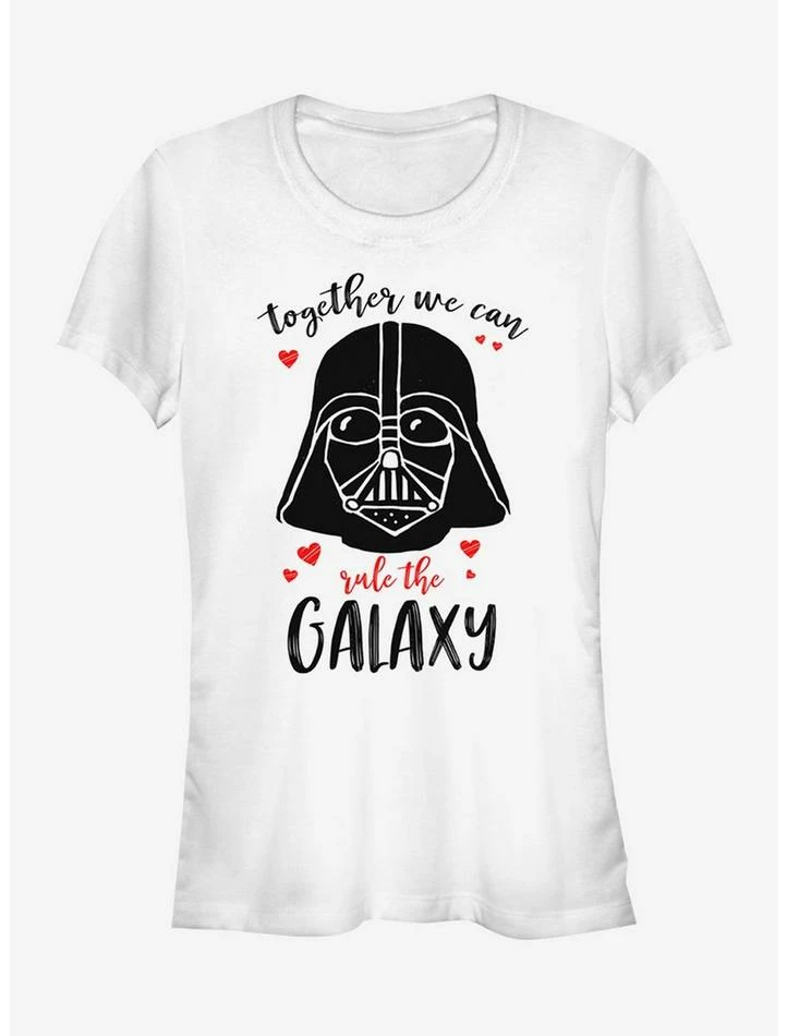 If you always fall for the bad boys then we have the shirt for you with the Star Wars Valentine’s Day Darth Vader Together Rule the Galaxy Juniors’ T-Shirt. Fall for Darth Vader with this fitted Star Wars Valentine’s Day tee that shows off the Sith Lord with cute script that says “Together We Can Rule the Galaxy” across the top.