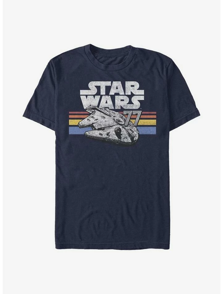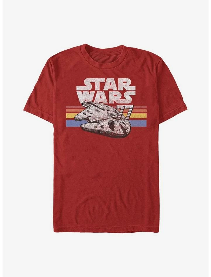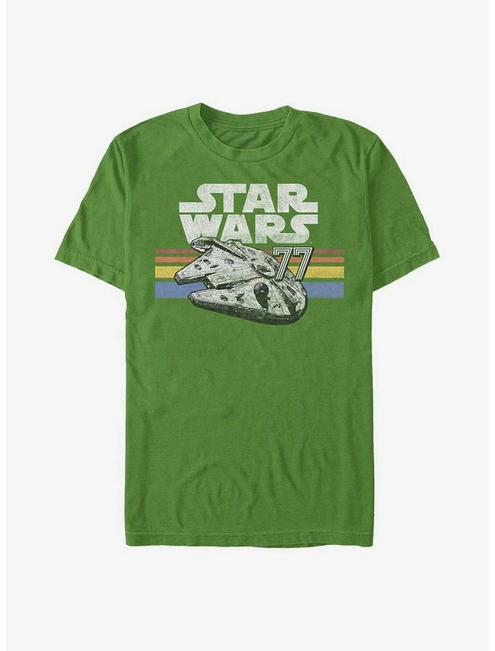 The fastest hunk of junk in the galaxy! This lightweight kelly green graphic tee features an image of the Millennium Falcon on stripes, with “77” — the year Star Wars: Episode IV – A New Hope was released — printed alongside.