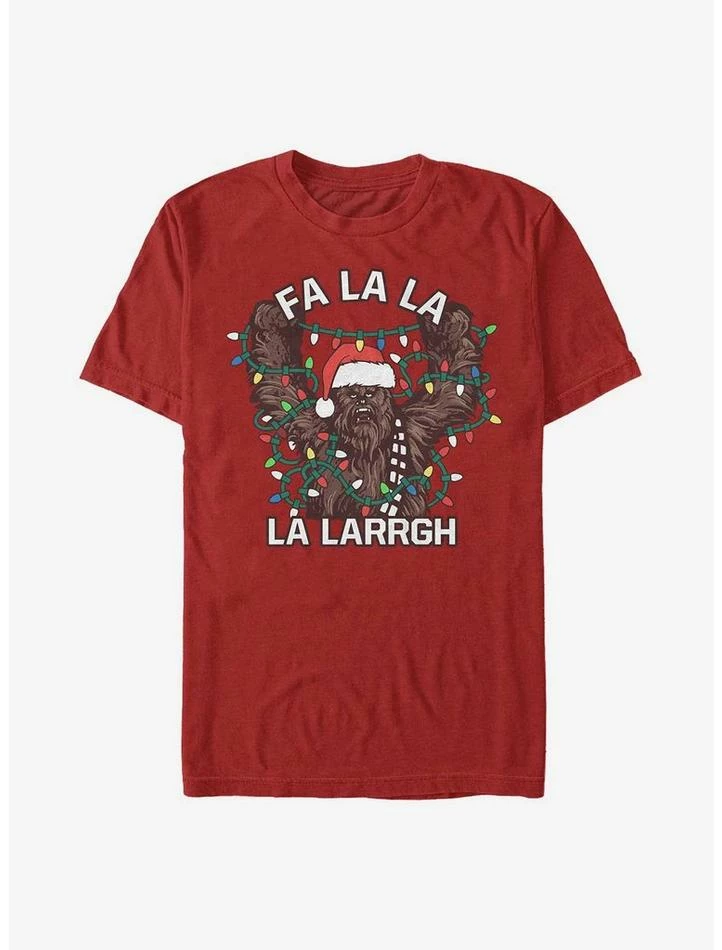 Uh-oh. Now you’ve upset a Wookiee! This lightweight red Star Wars tee features Chewbacca untangling some Christmas lights, with “FA LA LA LA LARRGH” verbiage above and below.