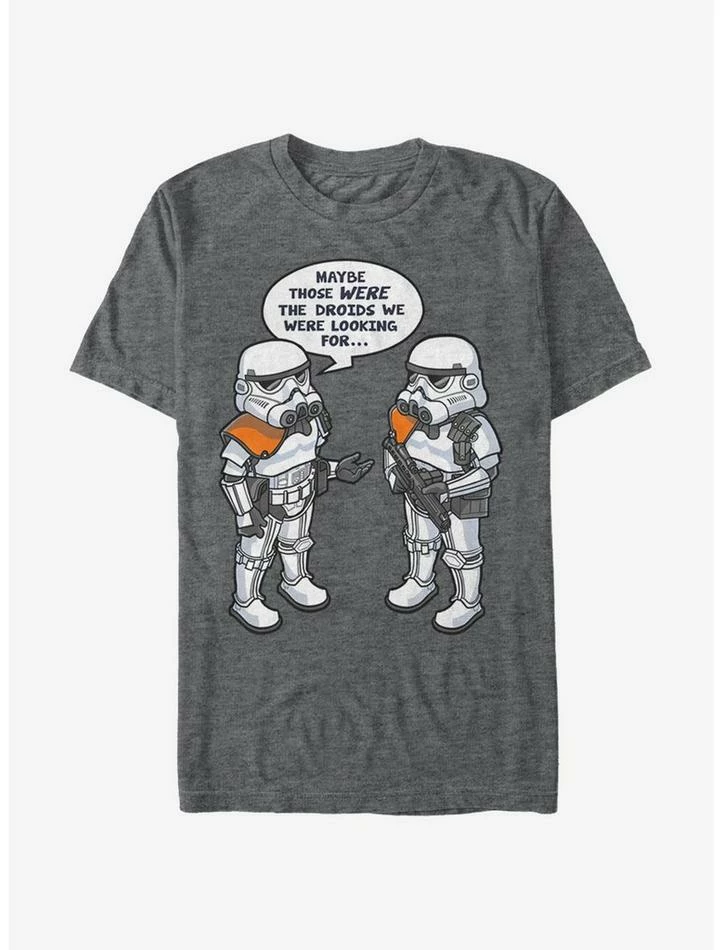 LOL. This shirt references the famous scene from Star Wars: Episode IV – A New Hope when Obi-Wan uses a Jedi mind trick to prevent the capture of C-3PO and R2-D2. This funny graphic tee features two Stormtroopers reminiscing on their failure as imperial detectives.