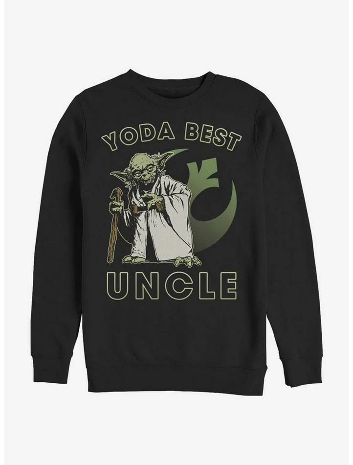 Yoda best! Give your uncle the props he deserves with this black crewneck Star Wars sweatshirt that has the little green Force-sensitive alien appearing alongside “Yoda Best Uncle” verbiage.