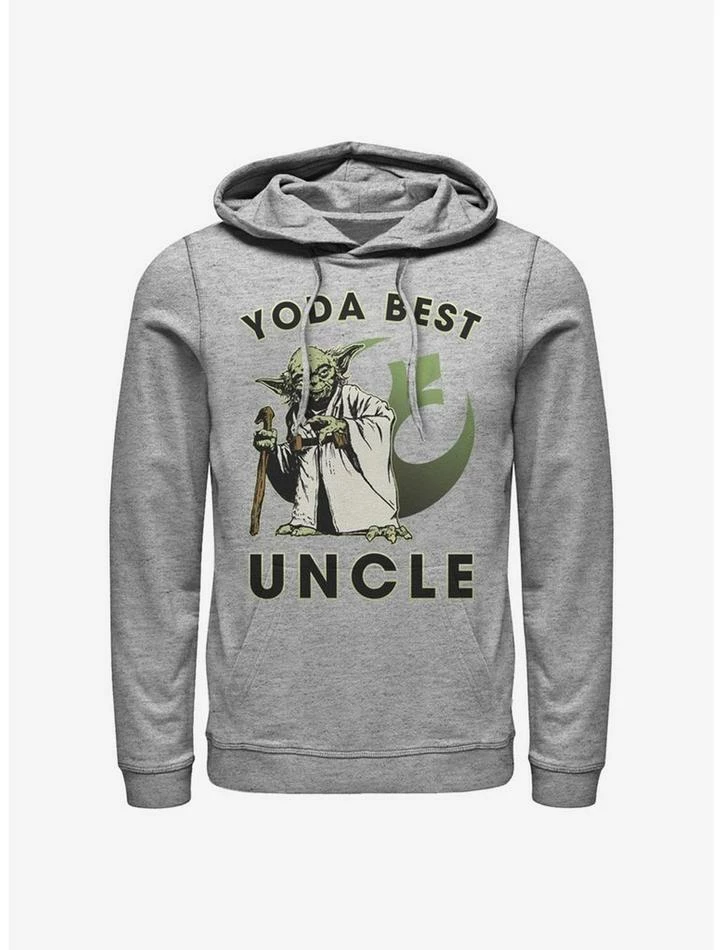 Yoda best! Give your uncle the props he deserves with this heather grey pullover Star Wars hoodie that has the little green Force-sensitive alien appearing alongside “Yoda Best Uncle” verbiage.